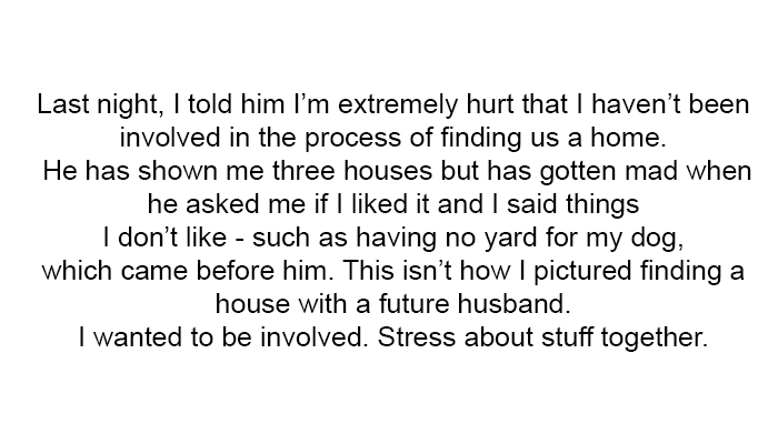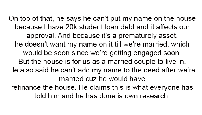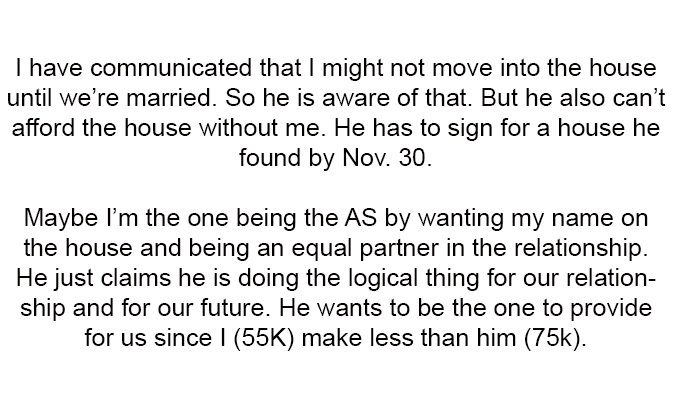He argues that it would be better to wait until they are married to add her name, even though they plan to live in the house together. The woman expressed her frustration about being left out of the house-hunting process and the lack of equal partnership in their relationship.