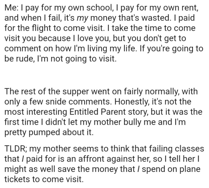 But the OP of today's story put his mom in her place when she tried to interfere in his studies. The OP paid his own tuition and rent for the first two years of university.