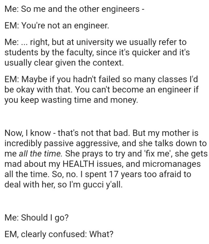 For clarification; while my mother probably just wants my brother and me to be happy, she has a history of verbal and emotional abuse towards us. She probably thinks she's being helpful, but she's withheld medical diagnoses, thrown tantrums, and I considered cutting her out entirely for years.And the comments from other Redditors roll in...