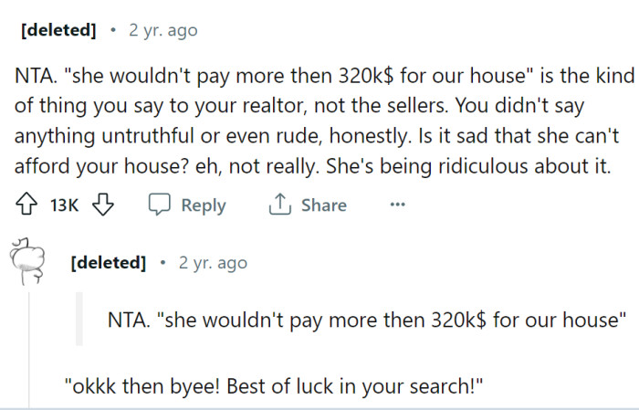 OP snapped at her, saying she shouldn't go looking at houses above their price range