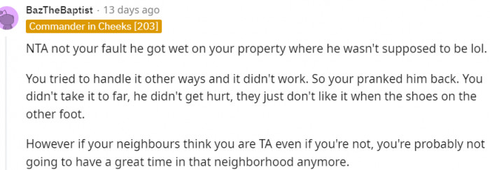 Then, he set up a camera and discovered who the prankster was. He reported it to his parents, but they did nothing about it, so he decided to baptize the boy with water himself.