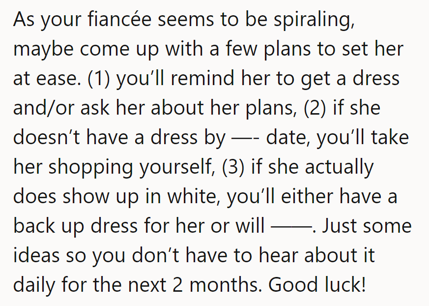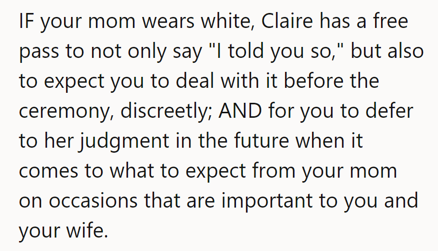 Claire's stressed about the wedding, fearing his mom wants to wear white due to not having a dress yet. OP reassures her, citing his mom's laziness.