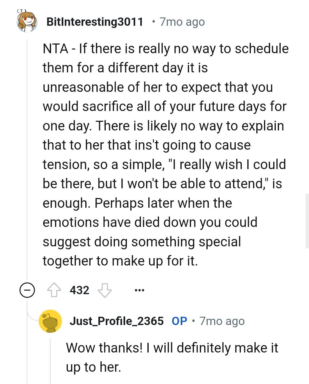 But what do you do when the person getting married is your sibling? The OP had no choice; something came up, and she wasn't about to give it up for a wedding.