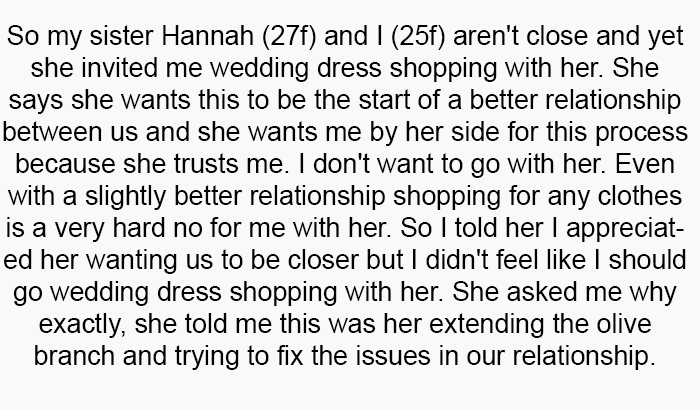 In an emotionally charged tale of family and forgiveness, a woman finds herself grappling with a difficult decision after her estranged sister, Hannah, invites her to participate in wedding dress shopping. Despite their rocky relationship, Hannah sees this event as an opportunity to mend fences and strengthen their bond. However, the deep scars from past conflicts, where hurtful remarks and actions have shaped their interactions, make the invitation less than appealing. The woman appreciates her sister's attempt to extend an olive branch but remains wary. Her refusal, rooted in painful memories and ongoing tensions, leads to further discord as Hannah insists on leaving the past behind and accuses her of being selfish for not embracing this chance for reconciliation. This story raises questions about the complexities of sibling relationships, the weight of historical grievances, and the challenges of navigating family dynamics during personal milestones.