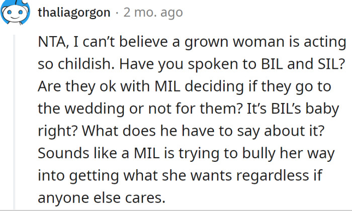 "Sounds like a MIL is trying to bully her way into getting what she wants"