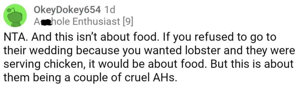 "If you refused to go to their wedding because you wanted lobster and they were serving chicken, it would be about food."
