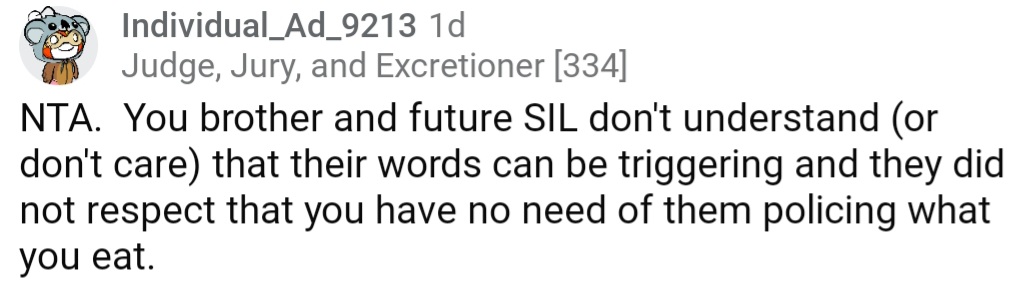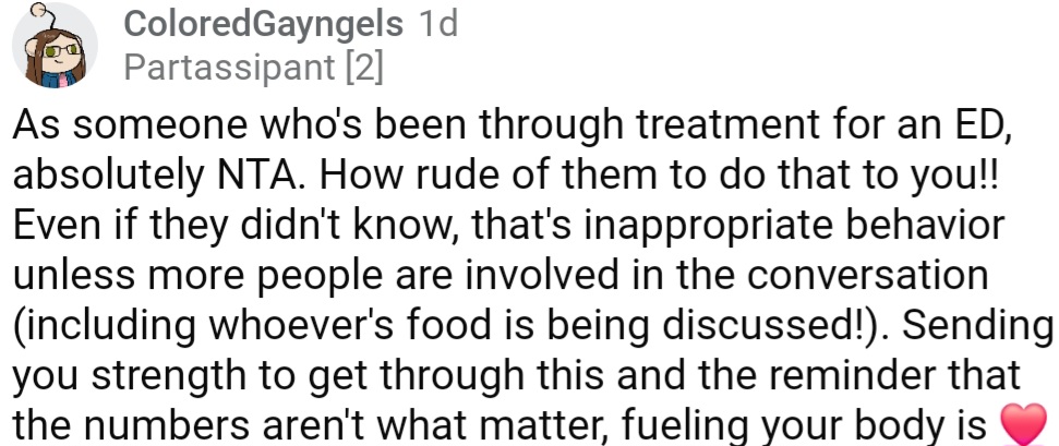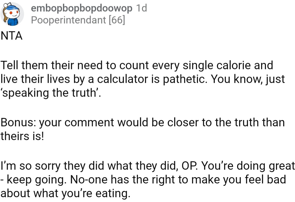 They went on to declare that OP’s meal was over the recommended daily intake and basically scolded them for it. Feeling humiliated and upset, OP pushed the food away and announced they didn’t want to eat anymore.