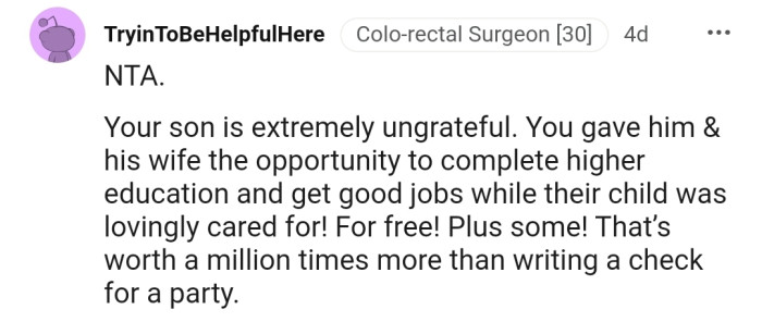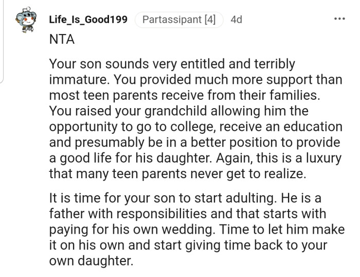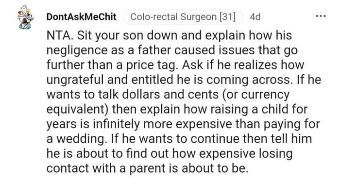 The Reddit community is strongly behind OP in this case, as they believe their son is being ungrateful for all the sacrifices that have been made for him in the past.