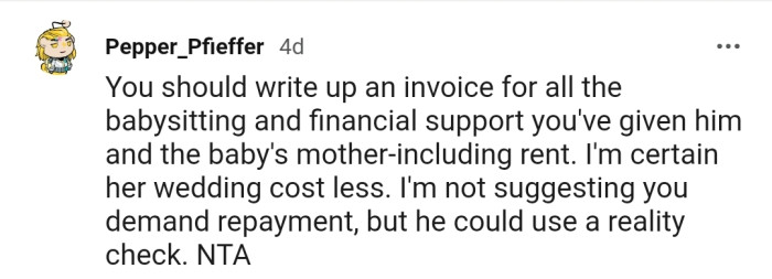 "You Should Write Up an Invoice for All the Babysitting and Financial Support You've Given Him and the Baby's Mother—Including Rent."