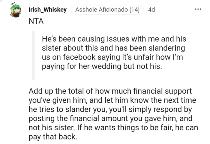 Now, as the family embarks on a new chapter, OP is eager to make amends by financing their daughter's wedding. However, this gesture has inadvertently stirred up feelings of resentment in their son, who believes he has been treated unfairly.