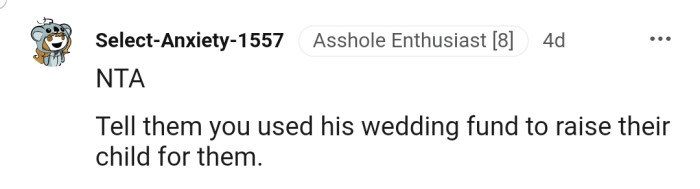 "Tell Them You Used His Wedding Fund to Raise Their Child for Them."