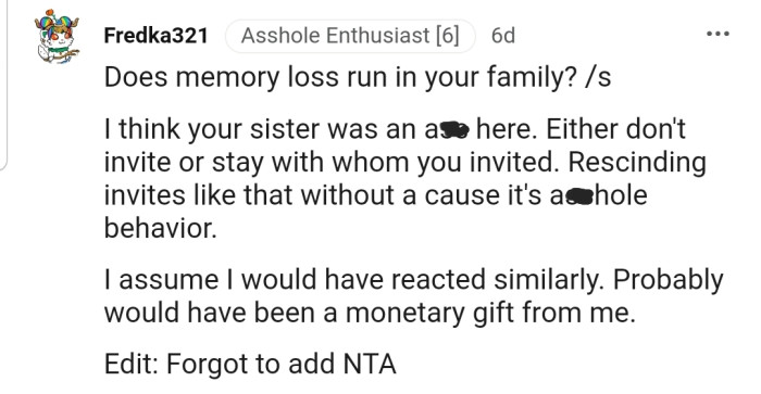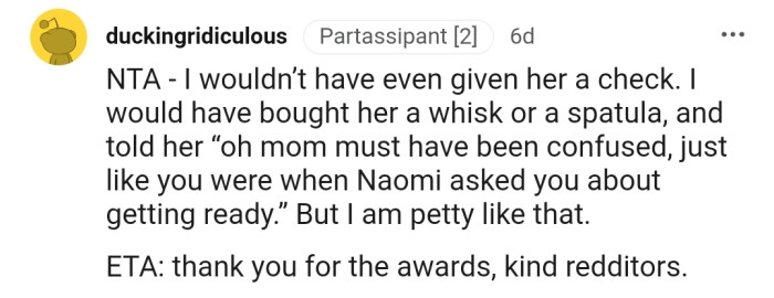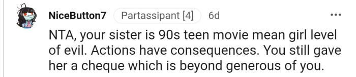 Some commenters even believe OP was far too generous to give their sister a check after her behavior. What do you think about OP’s actions?