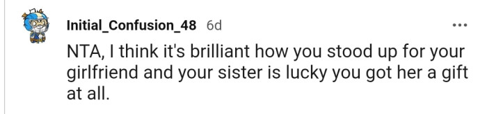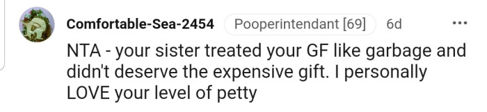 "Your sister treated your GF like garbage and didn't deserve the expensive gift."