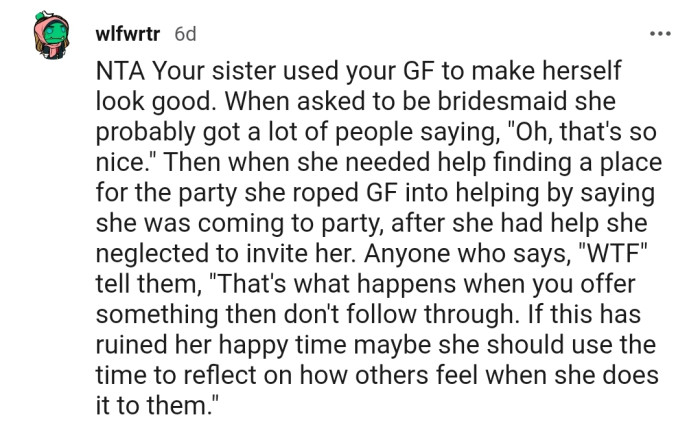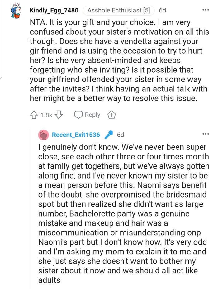 OP shared that their sister (Sarah) asked their decade-long girlfriend (Naomi) to be her bridesmaid. As someone who had never done this before, Naomi excitedly accepted this role.
