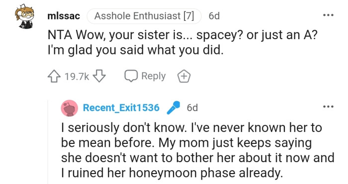 The commenters are fully behind OP on this matter. They also commended OP for standing up for Naomi, as they believed Sarah had treated her terribly.