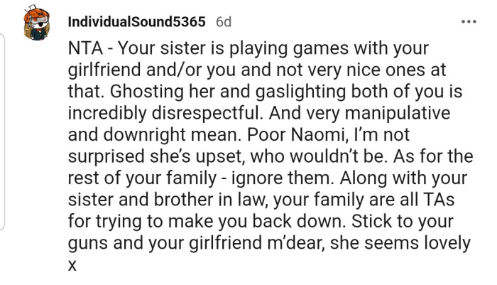 "Ghosting her and gaslighting both of you is incredibly disrespectful."