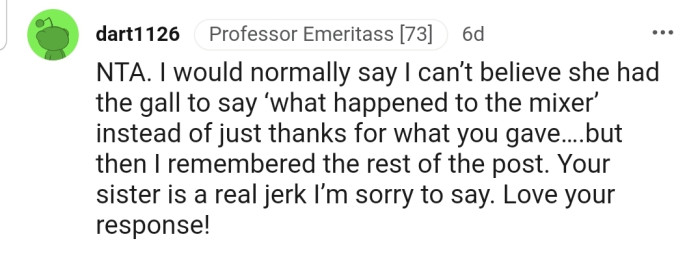 Sarah was quite surprised—where did the mixer go? Apparently, OP decided to be petty and return it a few days before the wedding.