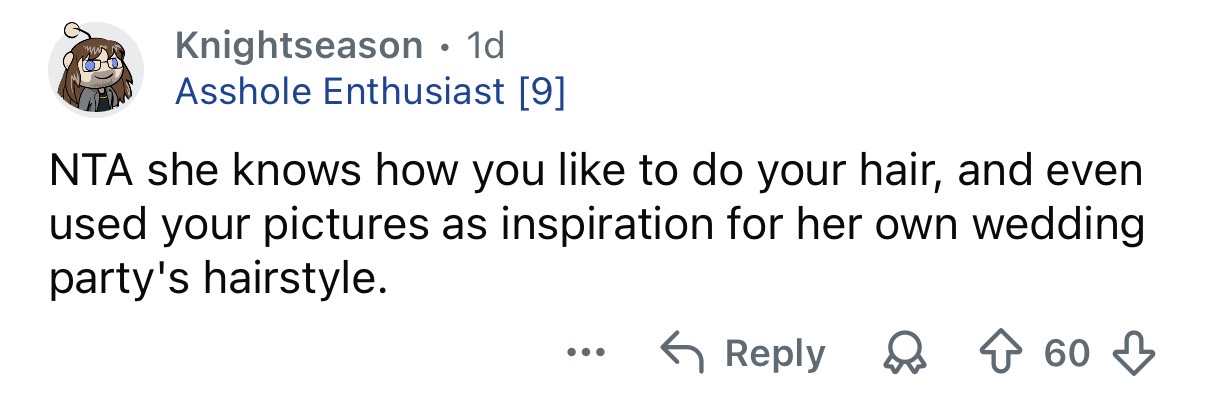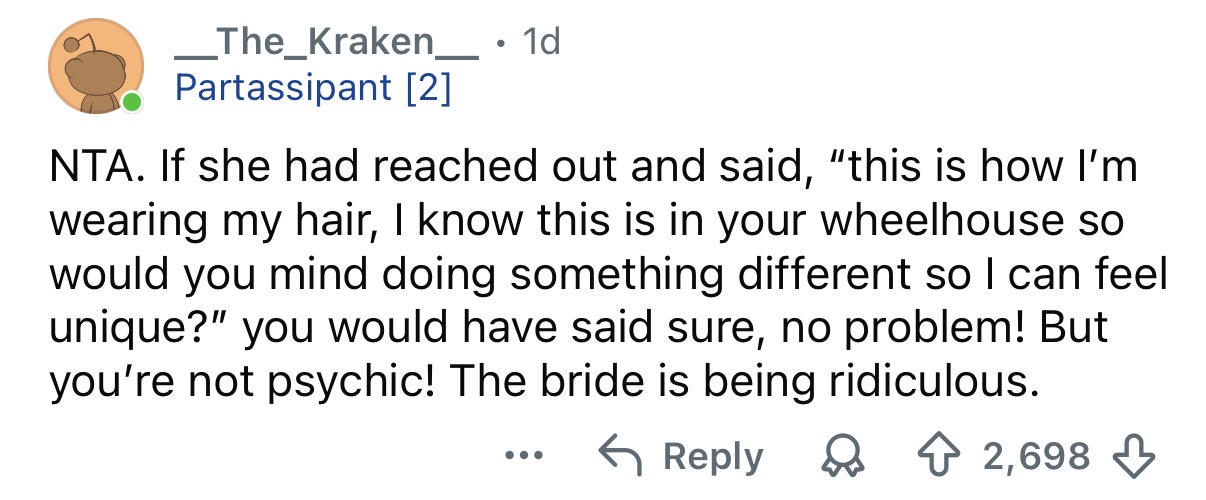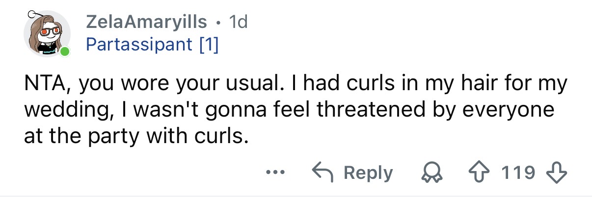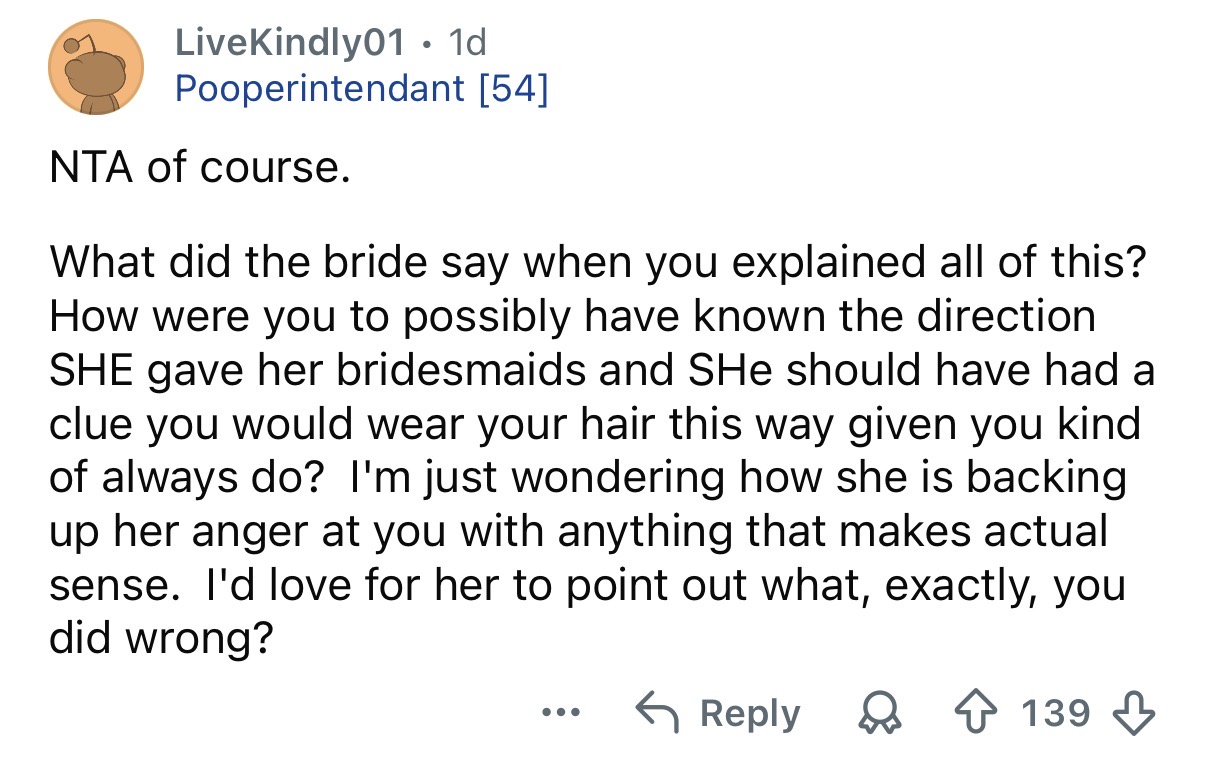 While the bride might have felt upstaged, it’s hard not to sympathize with someone who was just sticking to her usual style — one that, ironically, inspired the bridal party to begin with. Maybe next time, a quick “hey, I’m doing my hair like this” text could save a lot of post-wedding stress.