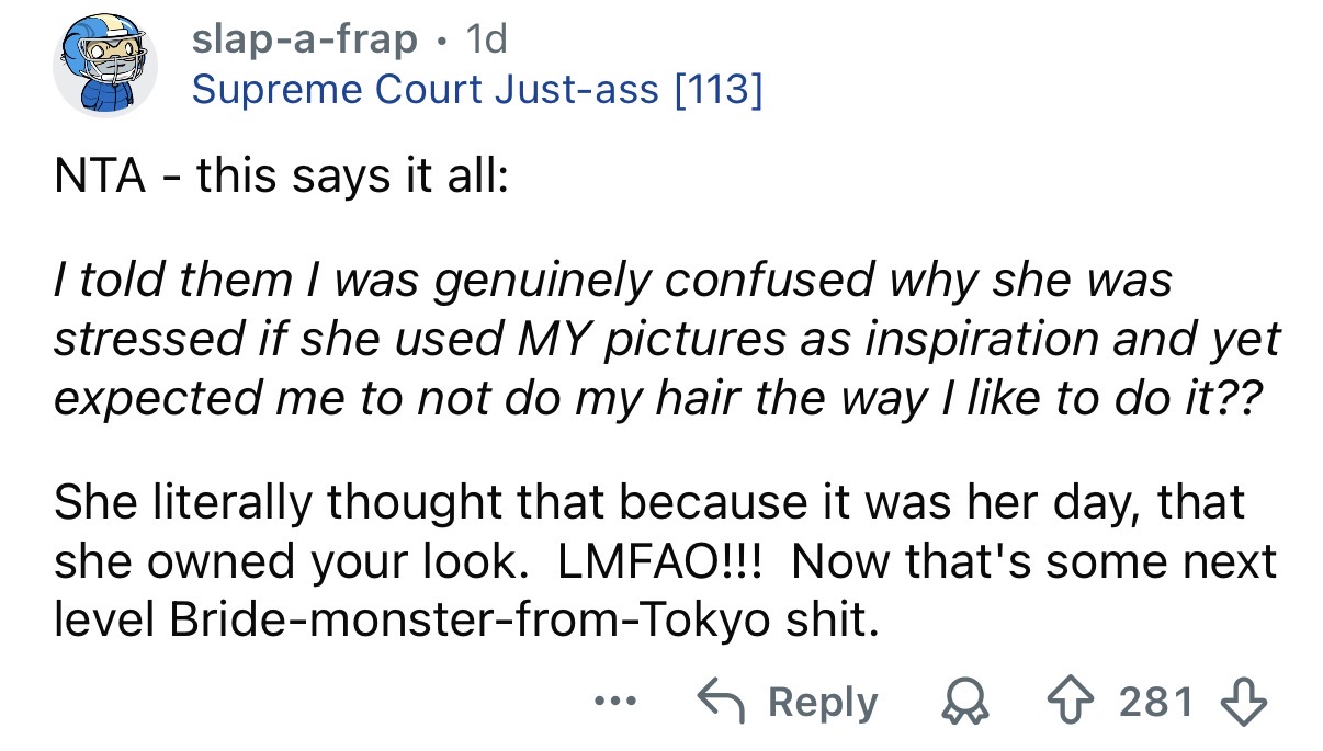 She claimed she was stressed because people might think the guest was trying to upstage her. The guest was confused, pointing out that the bride literally used her photos as inspiration and never mentioned any hair rules.