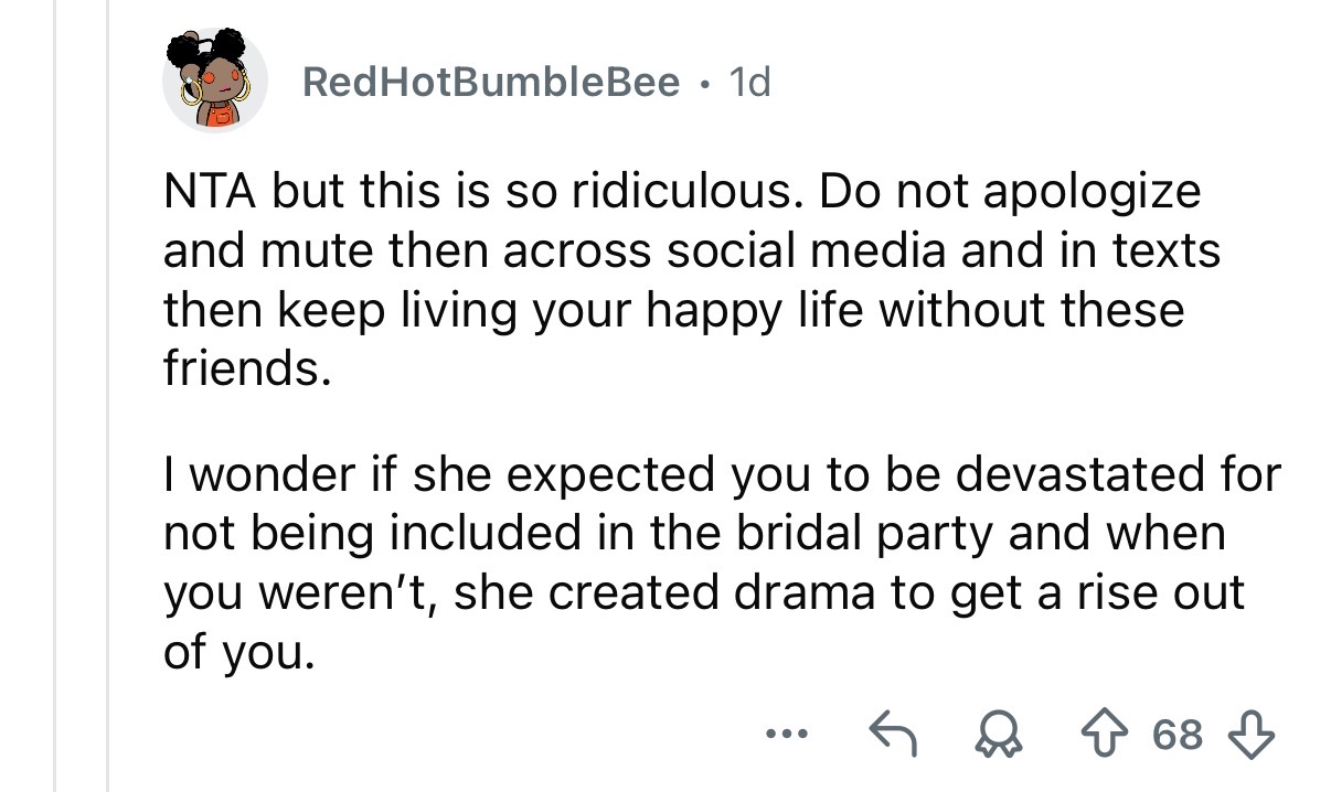 So I went to my friend's wedding, not in the wedding party but as a guest. I was never informed about what her dress looked like or any hair ideas. I typically wear my hair in a 60s-70s do whenever I go out or dress nicely. It's just a thing I've always enjoyed doing. My friends know this about me and often send me TikToks for inspiration since I love doing funky things with my hair and makeup, including this bride :) Anyway, I showed up in my usual do, bump in my hair and a dark green dress to fit in with her fall colors (the bridesmaids' dresses are like mustard yellow, by the way, so I in no way fit in). I was so excited because I noticed that the bridesmaids also had bumps in their hair. Not the same (my hair was down and theirs were pinned up). The bride, though, had her hair down with a bump. I was absolutely ecstatic! My friends in the bridal party were also so excited, and they mentioned that the bride told everyone to look at my Instagram for inspiration and Pinterest pictures to give the hairstylist (slay). Anyway, the bride was not happy. I mean, she was happy to my face but decided to text me three weeks after her wedding to tell me I'm an awful friend for having the "same hairstyle" as her and that she was worried people thought I was trying to fit in?? What? Also, a note: the bride and her bridesmaids are all my friends, but I was not a bridesmaid because she decided she wanted childhood friends (four) with her, and we met in college. I never said anything and honestly didn't really care about all that. Well, apparently, the bride got the bridesmaids to say I'm the bad guy and that I caused her so much stress. I told them I was genuinely confused why she was stressed if she used MY pictures as inspiration and yet expected me not to do my hair the way I like to do it?? Especially since no one told me, lol. Anyway, AITA here?The Emotional Landscape of Weddings