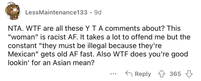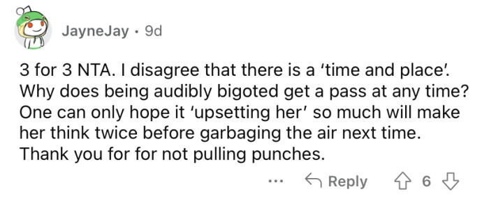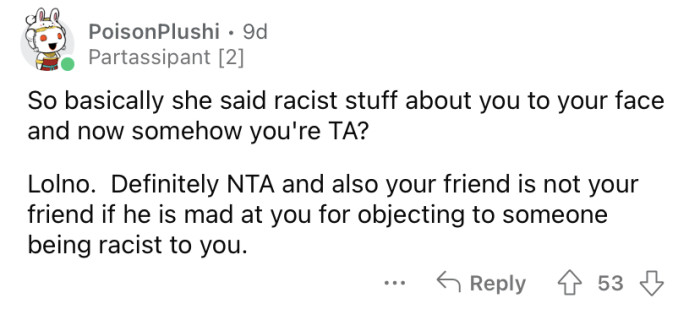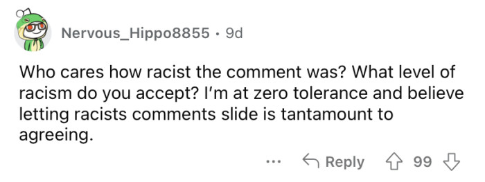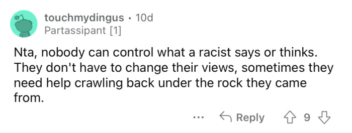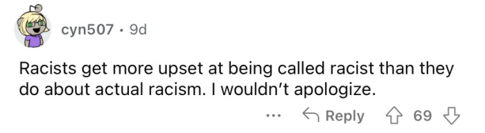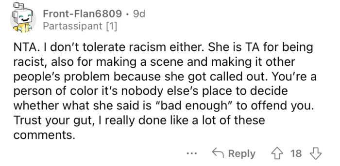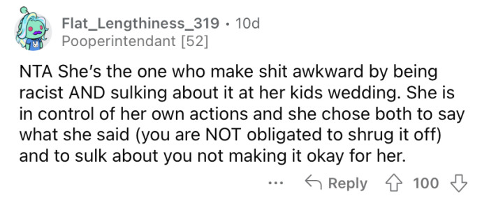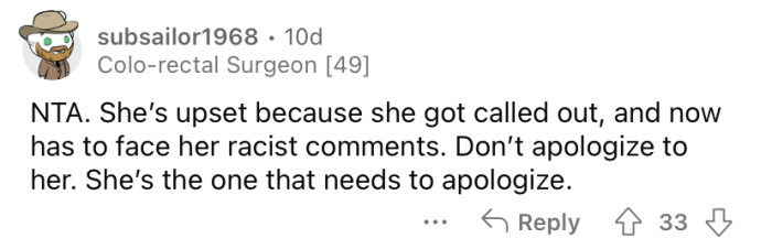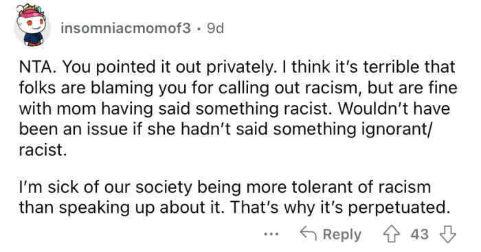 The OP responded, "Sorry for pointing out your racist comments." The mother walked off in a huff, unimpressed with how she had been spoken to.