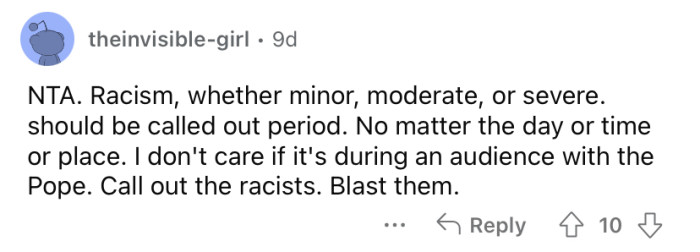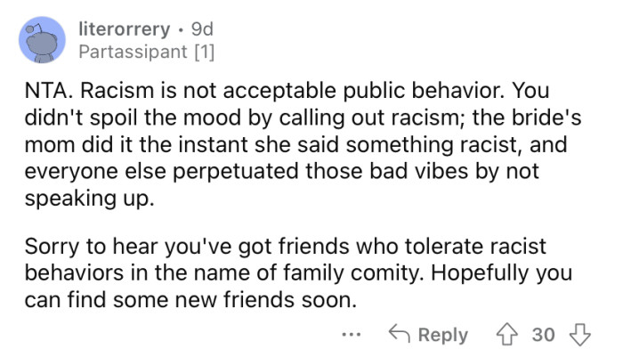 What's your take on this situation? Do you think the OP was wrong for bringing up the issue with the bride's mom, or did she deserve to be confronted about her racist remarks?