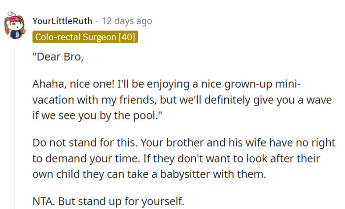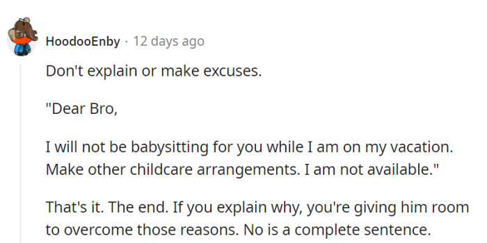 The ensuing message from his brother carried an additional shock: they expected OP to assist in babysitting their 4-year-old niece during the trip.