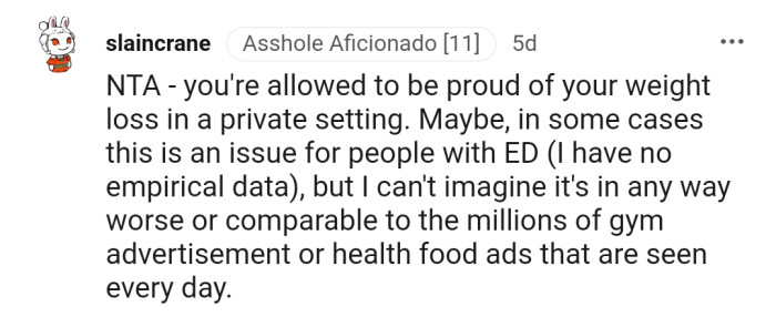 "NTA - You're Allowed to Be Proud of Your Weight Loss in a Private Setting."