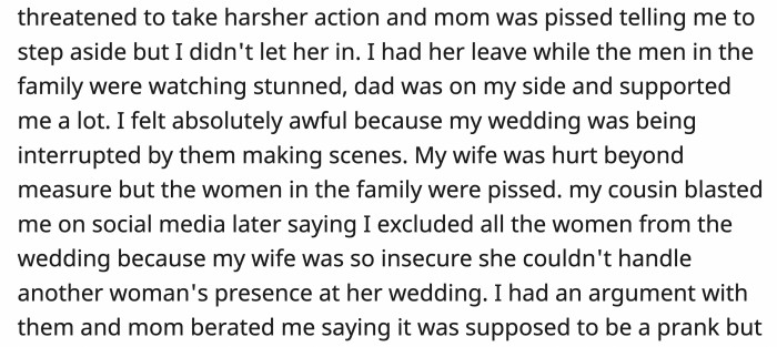 OP's wife was hurt beyond words, and so were the bullies. His cousins posted on social media, trying to play the victim, saying OP barred all the women in the family from coming to the wedding because his new wife is so insecure she can't stand to have other women there.