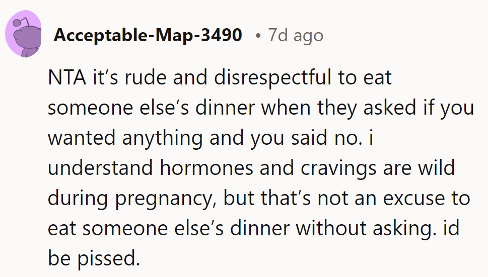 "Hormones and cravings are wild during pregnancy, but that's not an excuse to eat someone else's dinner without asking. Respect the dinner boundaries, folks."