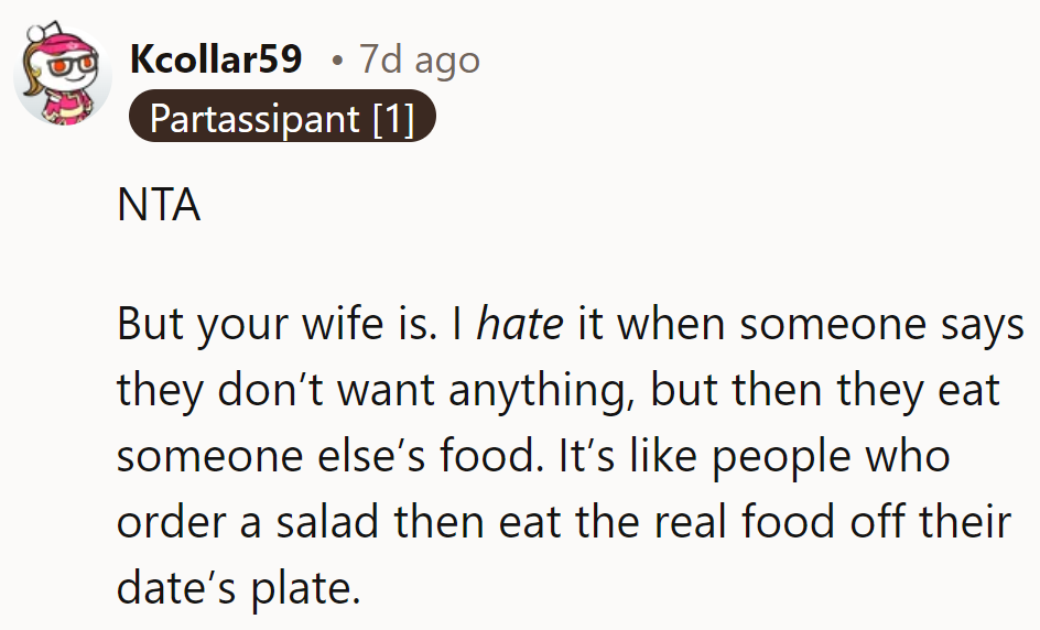 "I hate it when someone says they don't want anything, but then they eat someone else's food."