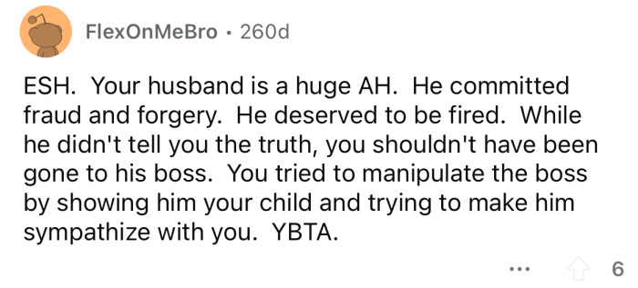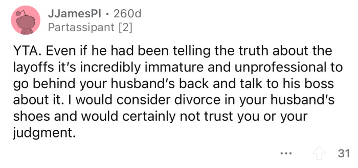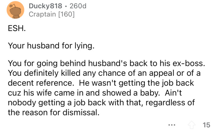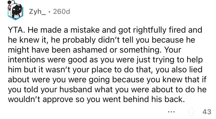 What are your thoughts on this situation? Do you think the OP was out of line for going behind her husband's back to speak with his boss, or is her husband the real a**hole here for being so dishonest?