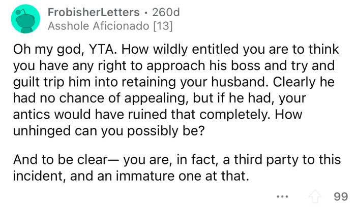 "How wildly entitled you are to think you have any right to approach his boss."