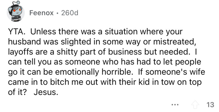 The OP says she tried to get her husband's boss to "look at the baby" in the hopes that he would reconsider his decision to lay off a new father. However, the boss seemed surprised, saying he was sorry, but he would not be changing his mind at this time.