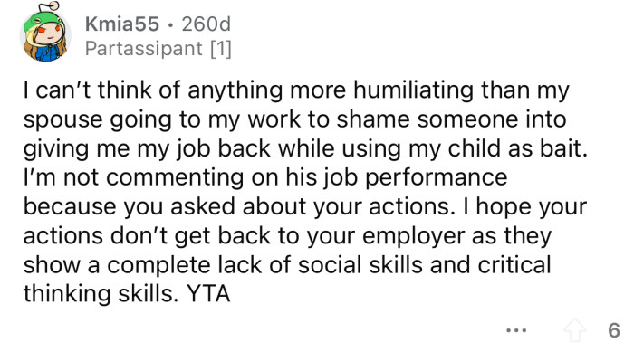 "I can't think of anything more humiliating than my spouse going to my workplace to shame someone into giving my job back."