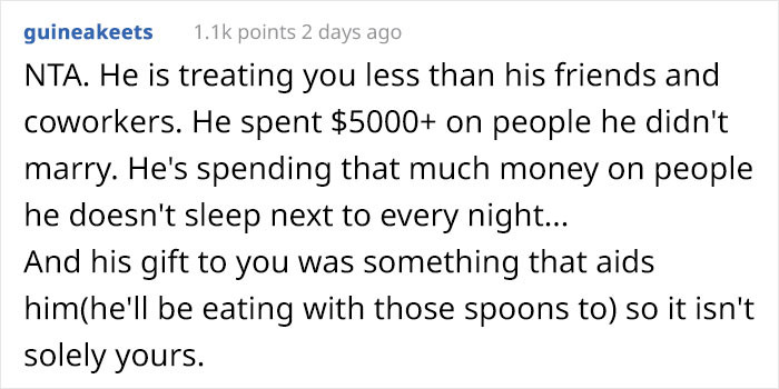 The Redditor said that her husband bought her a spoon set for $20 while spending more than $5,000 on lavish gifts for his friends.