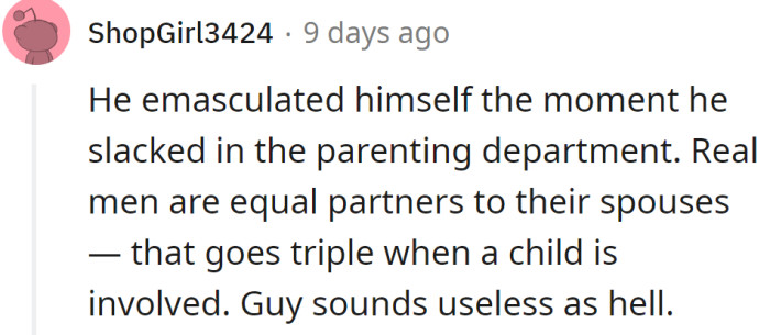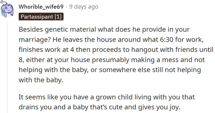 Redditors supported the OP and told her that her husband acts like a child. They also couldn't understand why he had no interest in interacting with his child.