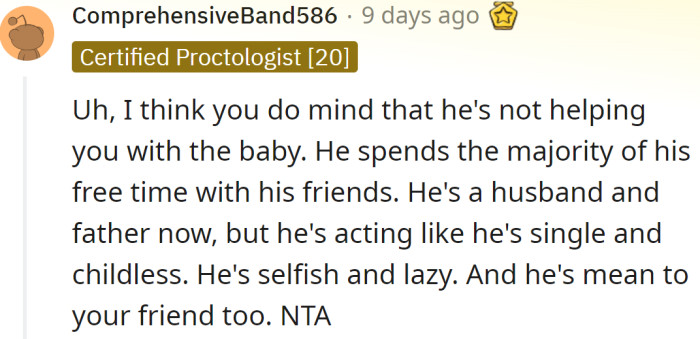 He and his wife, the Redditor who shared this story, are married and have a six-month-old baby. His wife shared that they have the same circle of friends and that her husband spends much more time hanging out with them than she does, as she is the one who primarily takes care of the baby.