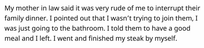 Her mother-in-law told OP that it was rude of her to interrupt their dinner. OP rightfully pointed out that she wasn't trying to join their table and wished them a great meal before walking away.