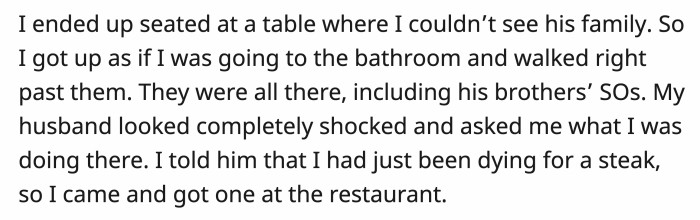 OP's husband was shocked when he saw OP walking past them and asked what she was doing there. OP cheekily replied that she was craving steak and decided on the one offered at the restaurant.