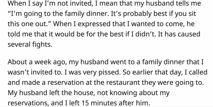 The husband left for his family dinner, and OP left the house 15 minutes after him. At the restaurant, OP was given a table where she couldn't really see him and his family.