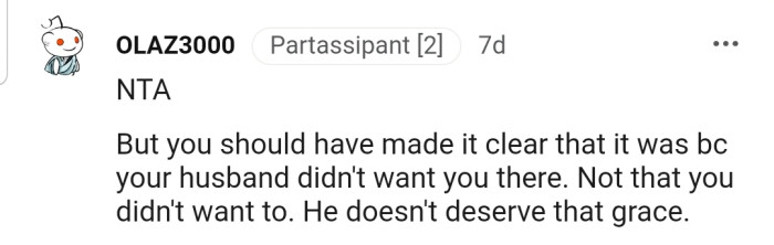 "You should have made it clear that it was bc your husband didn't want you there. Not that you didn't want to."