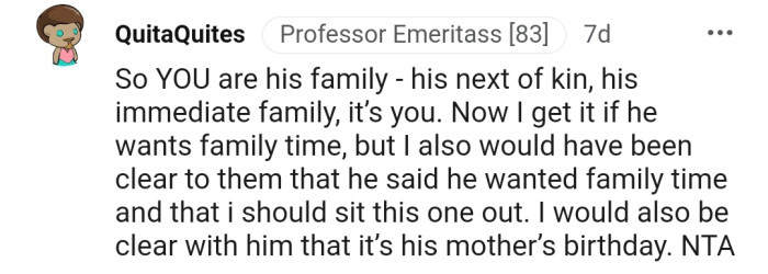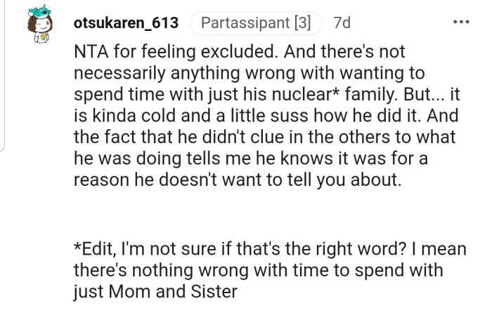 "There's not necessarily anything wrong with wanting to spend time with just his nuclear* family. But... it is kinda cold and a little suss how he did it."