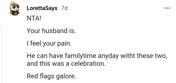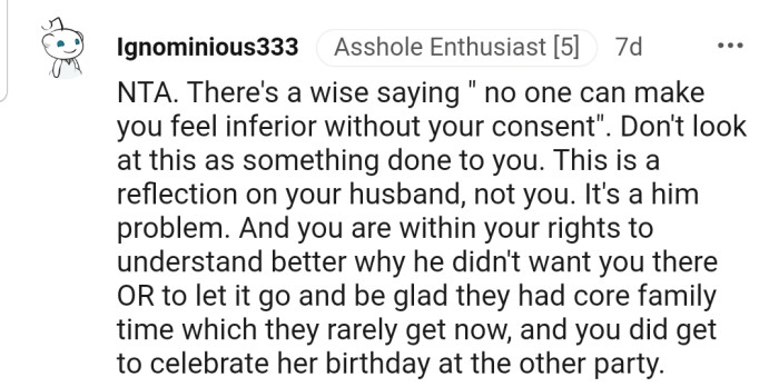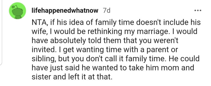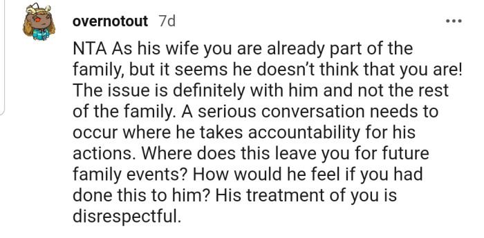 Some commenters also shared that they think OP’s husband not inviting them is a red flag; one that could signify that their husband has one leg out of the marriage.