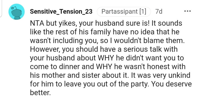Do you think OP’s husband’s reason for not inviting them to the dinner is valid? Let us know in the comments below!