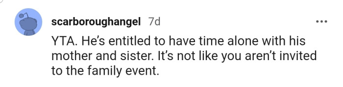 "YTA. He’s entitled to have time alone with his mother and sister"