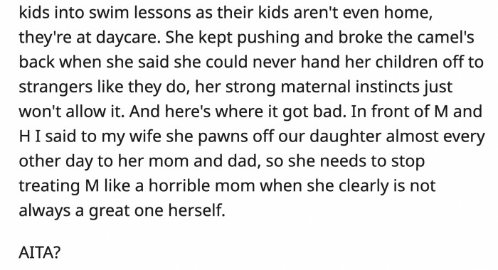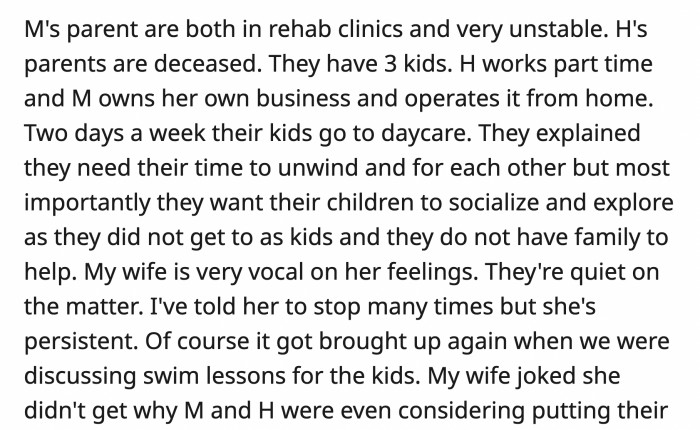 The issue was brought up again when they were all talking about swimming lessons for all of the kids. OP's wife "joked" about not understanding why M and H are even considering lessons for their three kids when they mostly stay at daycare.