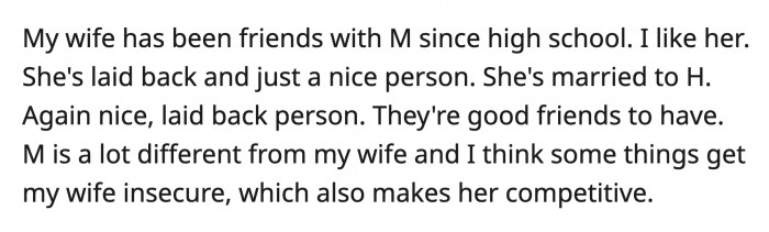 OP's wife and M have been friends since they were in high school. M is married to H, and OP likes them both because they are nice, laid-back people.