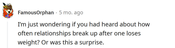 Reddit/ThrowRA91109He explained that he and his wife are struggling after her drastic weight loss.