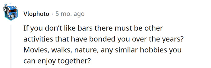The Redditor's wife is upset that he doesn't like to go out to bars with her.